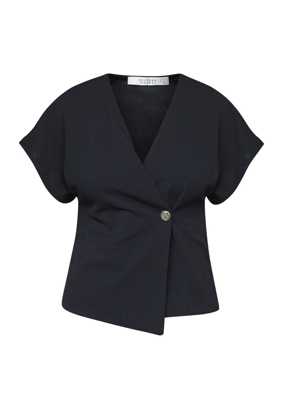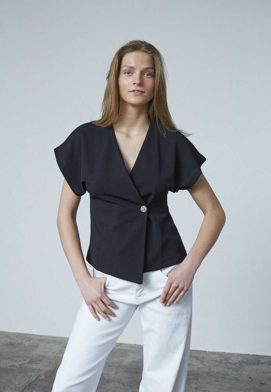 GEVELA-VE är en kortärmad topp med djup V-ringning och en asymmetrisk stängning i sidan med en enda guldfärgad knapp. Toppen har lätt markerade axlar och en figursydd silhuett. Modellen bär storlek S material: 92% Polyester 8% Elastane